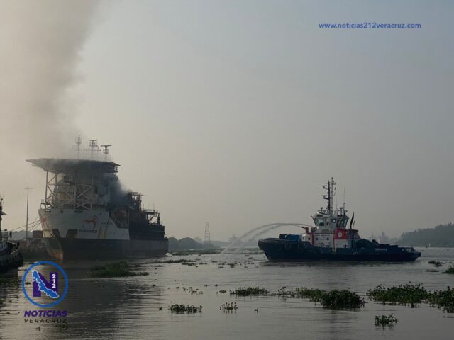 El buque Blue Phoenix se incendió atracado en los muelles de Permaducto perteneciente al grupo empresarial Protexa en Villa Allende, municipio de Coatzacoalcos.
