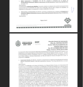 Otra empresa de Xalapa hizo propuso el importe más bajo, pero fue desechada por no contar con diversos documentos técnicos relacionados con las especificaciones solicitadas para los trabajos. Además, otras empresas de Coatzacoalcos y Xalapa participaron en el inicio del proceso de licitación, pero no continuaron con el mismo.