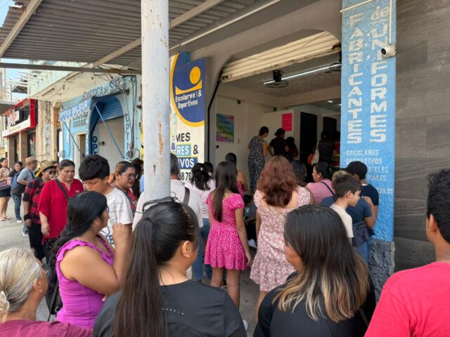 En el marco del arranque del ciclo 2025-2026, padres de familia hacen largas filas en algunos negocios de venta de uniformes, siendo estos los únicos sitios donde pueden adquirirlos.
