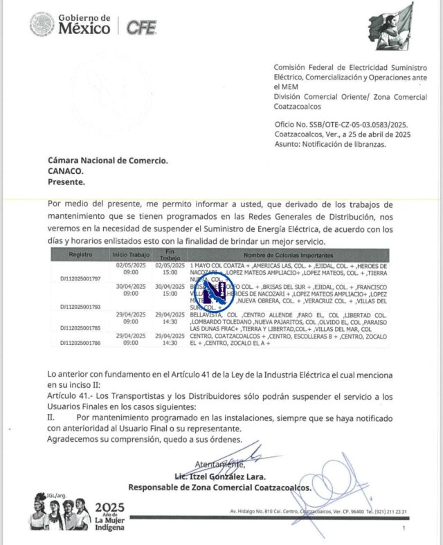 La empresa de luz informó principalmente a la Canaco Coatzacoalcos para exhortar a sus agremiados y a la ciudadanía en general a tomar las precauciones necesarias ante estos cortes programados, con el fin de reducir impactos en sus actividades comerciales y cotidianas.