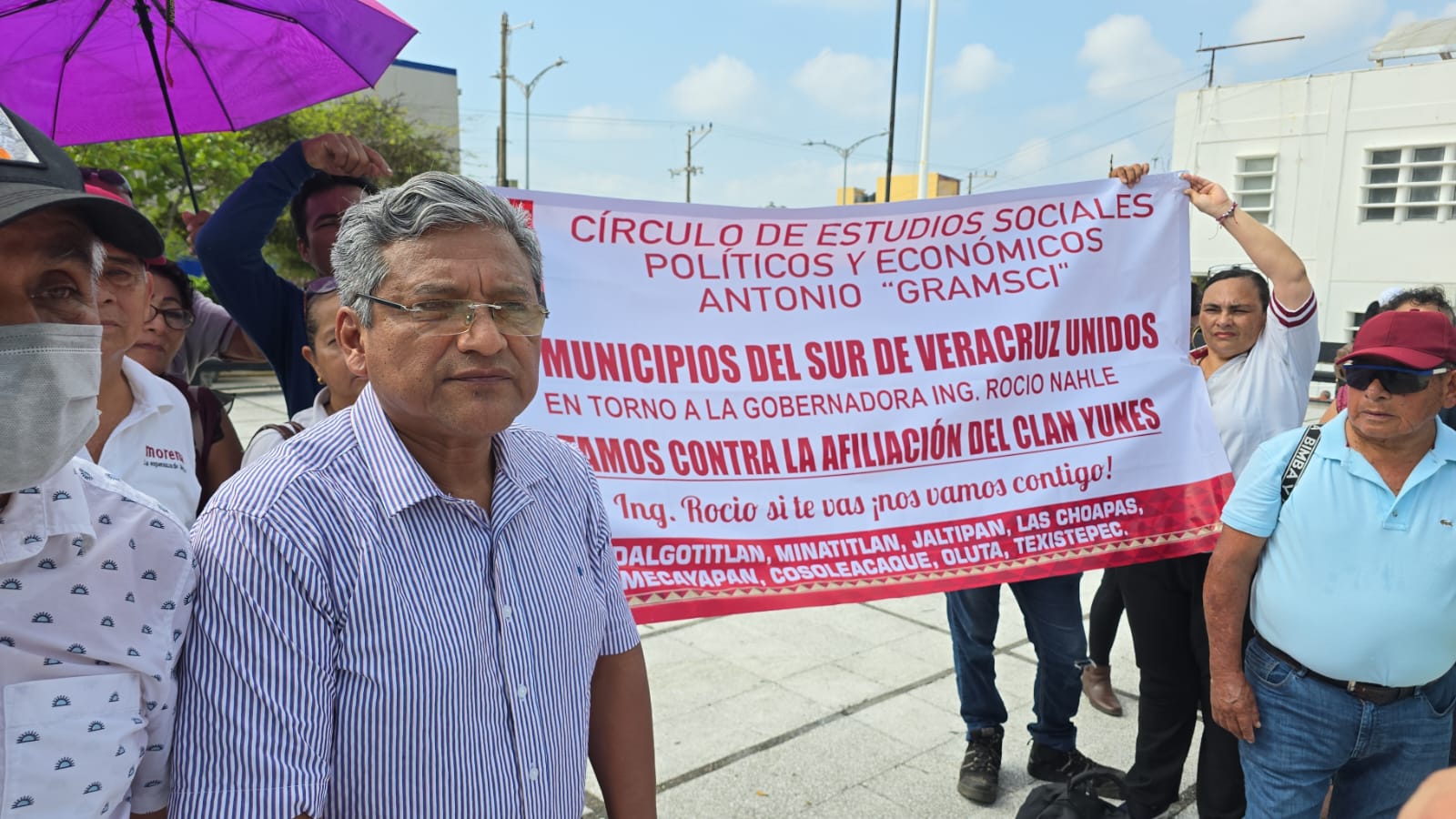 Integrantes del Movimiento de Regeneración Nacional (Morena) se manifestaron para expresar su rechazo a la afiliación del senador Miguel Ángel Yunes Márquez, al nepotismo y la reelección.
