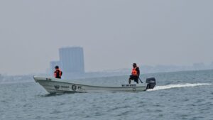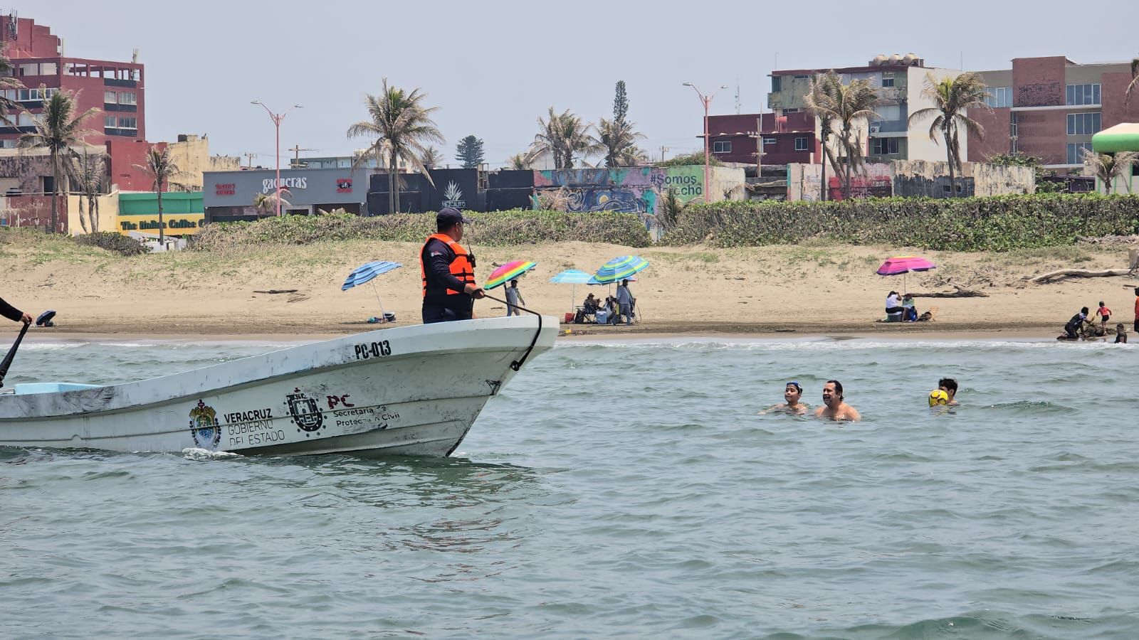 Elementos de Protección Civil y la Policía Estatal en coordinación con la Secretaría de Marina recorren la playa de Coatzacoalcos en lancha para atender cualquier emergencia.