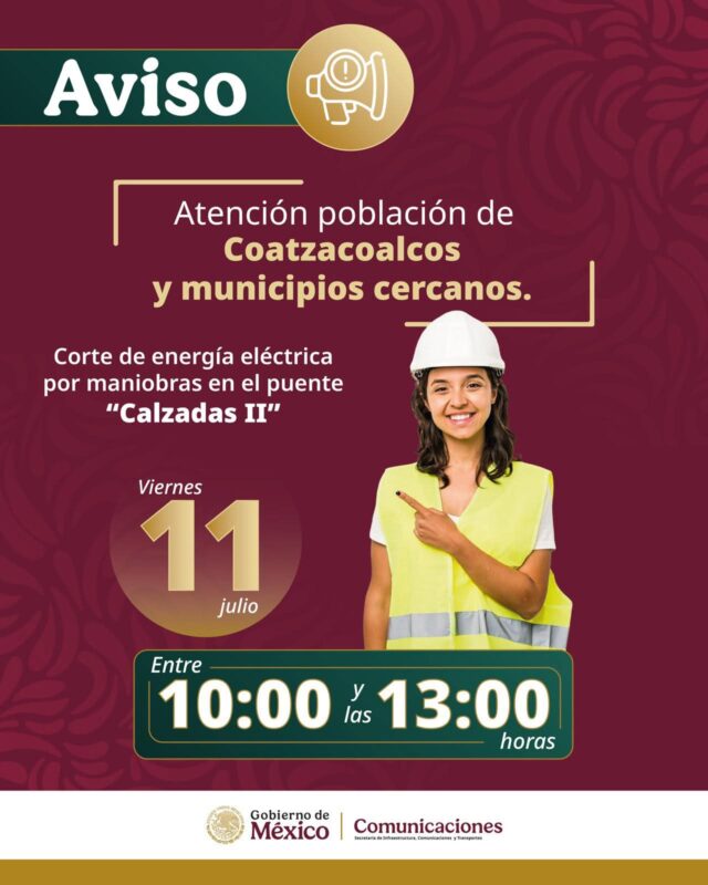 El Centro SICT Veracruz informó que este viernes 11 de julio se interrumpirá temporalmente el suministro de energía eléctrica en diversas colonias de Coatzacoalcos, como parte de las maniobras que se realizarán en el puente Calzadas II, que une a esta ciudad con Minatitlán.