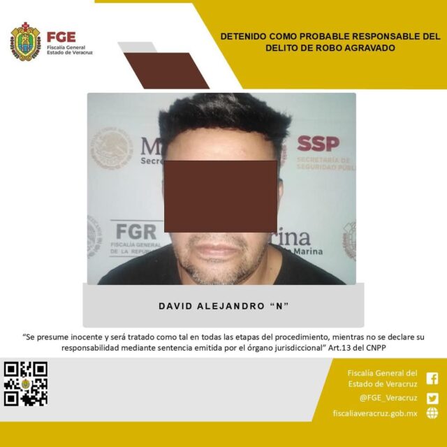 Xalapa, Ver., a 31 de marzo del 2025.-La Fiscalía General del Estado informa que, elementos de la Policía Ministerial en colaboración con policías de investigación de la Fiscalía General de Justicia de la Ciudad de México, cumplimentaron en aquella ciudad, orden de aprehensión en contra de David Alejandro “N” presunto alto generador de violencia posiblemente relacionado con otros robos a casa habitación en esta entidad y la CDMX, como probable responsable del delito de robo agravado.