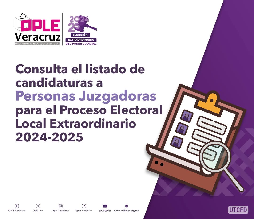 Los nombres de las y los candidatos al Tribunal Superior de Justicia, Tribunal de Disciplina Judicial, Tribunal de Conciliación y Arbitraje, asi como q los juzgados de Primera Instancia ya se puede consultar en el link https://www.oplever.org.mx/wp-content/uploads/2025/Judicial/LISTADO_CANDIDATURAS_PEEPJL_2024-2025.pdf