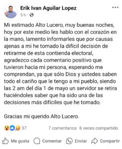 A un par de días de inicio del periodo de campañas, el ex diputado local Eric Iván Aguilar López anunció en redes sociales su retiro de la contienda por causas ajenas.