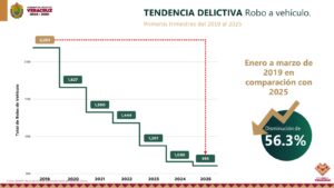 Otro de los datos destacados es la reducción del robo de vehículo automotor: en el primer trimestre del año disminuyó 56.3 % en comparación con el mismo periodo de 2019, y 3.5% respecto a 2024; se trata del nivel más bajo de incidencia en este delito, para un primer trimestre, desde 2015.