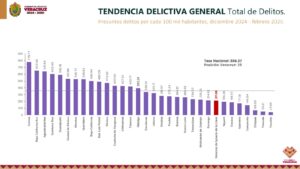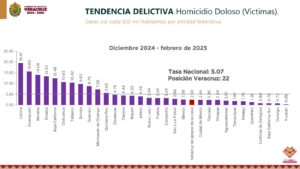 Xalapa, Ver., martes 15 de abril de 2025.- De acuerdo con datos del Secretariado Ejecutivo del Sistema Nacional de Seguridad Pública, Veracruz ocupa el lugar 25 en delitos por cada 100 mil habitantes; aunado a que en el primer trimestre de 2025, la incidencia delictiva disminuyó un 15 % en comparación con el mismo periodo de 2019, y del 11.2 % respecto al primer trimestre de 2024.