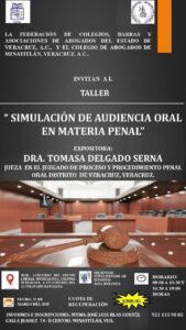 La Federación de Colegios Barras y Asociaciones de Abogados del Estado de Veracruz A.C.y el Colegio de abogados de Minatitlán Veracruz, unieron sus esfuerzos para llevar a cabo una conferencia titulada «Simulación de audiencia oral en materia Penal», que será disertada por la Doctora Tomasa Delgado Serna en el vecino municipio de Minatitlán.