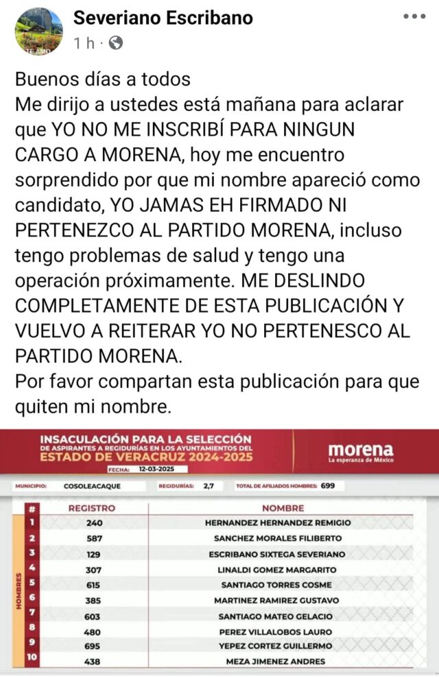 Me dirijo a ustedes está mañana para aclarar que YO NO ME INSCRIBÍ PARA NINGUN CARGO A MORENA, hoy me encuentro sorprendido por que mi nombre apareció como candidato, YO JAMAS EH FIRMADO NI PERTENEZCO AL PARTIDO MORENA, incluso tengo problemas de salud y tengo una operación próximamente. ME DESLINDO COMPLETAMENTE DE ESTA PUBLICACIÓN Y VUELVO A REITERAR YO NO PERTENESCO AL PARTIDO MORENA.